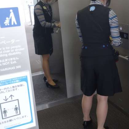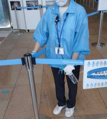 あべのハルカスのフロア内では、感染症対策として手すりやガイドポールなどを従業員の方々がこまめに消毒をしてくださっています。