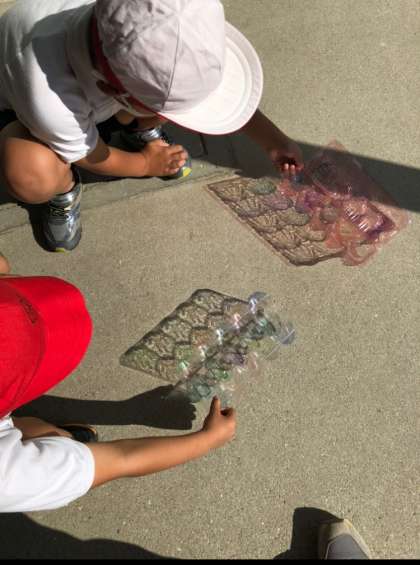 「ひかりのプレゼント」の学習をしました。たまごパックにペンで色をつけ、ひかりをとおしてみました。地面や画用紙、壁や手など色々なところにうつしました。友だちのたまごパックと組み合わせたり、横から見たりして、見え方を楽しみました。