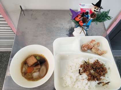 鶏肉のたつたあげ、あつあげと野菜の煮もの、おかかなっ葉