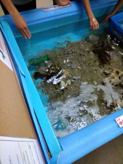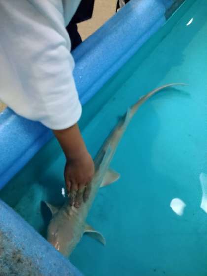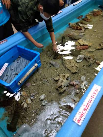 学級写真を撮り、色々な魚や海老を触りました!!
