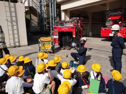 AEDの説明や実際に消防車から放水の様子を見せてもらいました