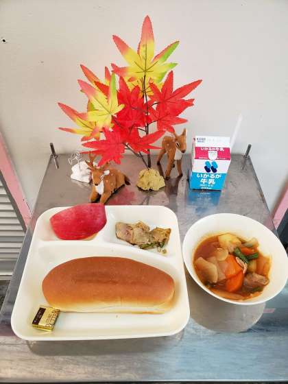 豚肉のカレー風味焼き、ケチャップ煮、りんご、バター