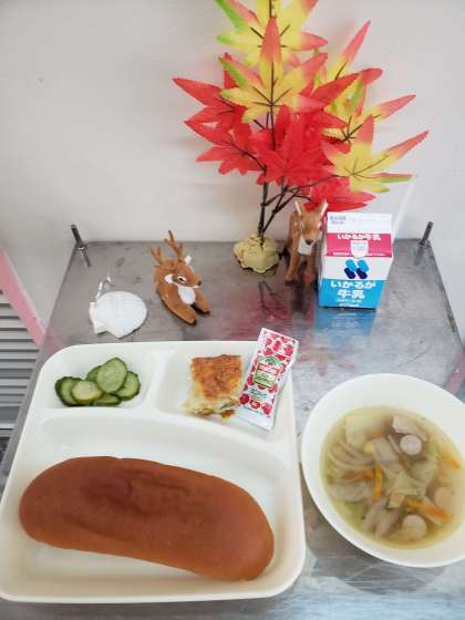 ツナポテトオムレツ、スープ、きゅうりのバジル風味サラダ
