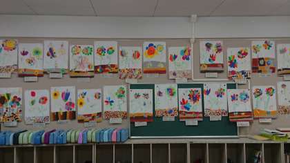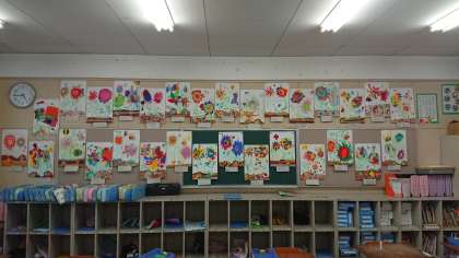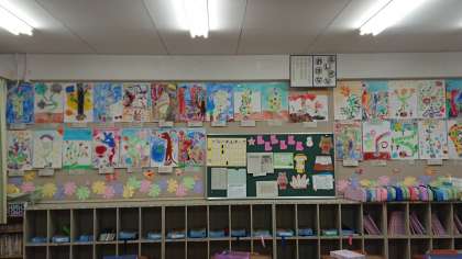 1年生は、今川アートウィークで「ふしぎなおはな」を描いて展示しています。