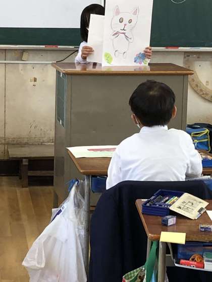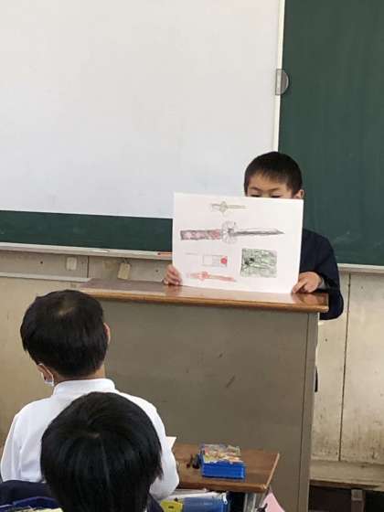 「たからものをしょうかいしよう」の学習では、はじめ・中・おわりの組み立てで話すことを考えました。紹介したいことが伝わるように、絵を見せながら、声の大きさや速さに気をつけて発表しました。