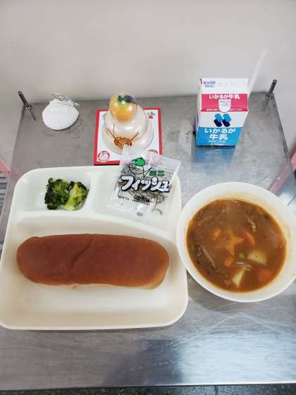 ビーフシチュー、ブロッコリーのサラダ、ミニフィッシュ
