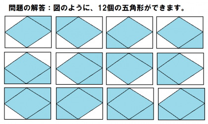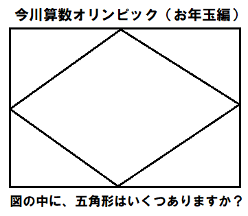 1月の学校だよりに掲載した、今川算数オリンピックの問題は、長方形とひし形を重ねた図形です。この図形の中に、五角形をいくつ見つけることができるだろうかという出題でした。長方形とひし形は、ともに四角形のなかまですが、「組み合わせることで五角形ができる。おもしろい‼」という気付きを意図して、出題しました。全部で12通りの五角形ができます。