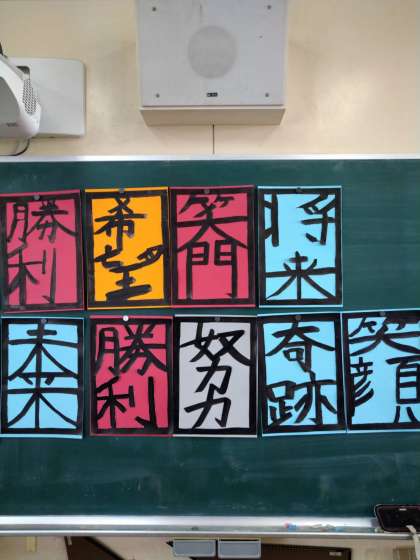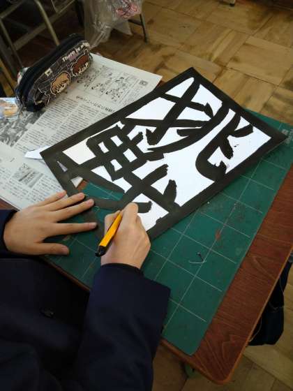 自分の好きな熟語を筆で書き、余白の部分をカッターで切りました。個性的な作品が完成しました。