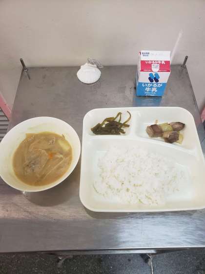 まぐろの甘辛焼き、豚汁、くきわかめのつくだ煮