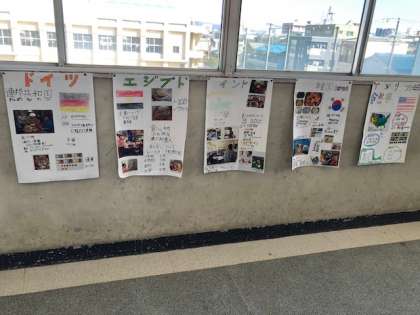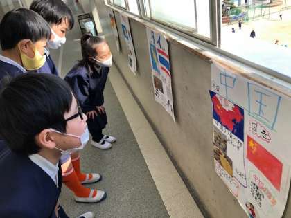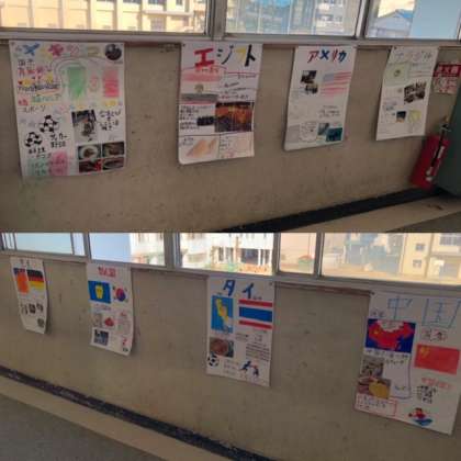 ?外国のことをしょうかいしよう の単元で作ったポスター。どのクラスも発表が終わりましたので、廊下に掲示しています。