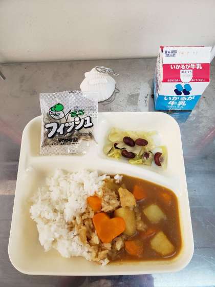 チキンカレーライス、ビーンズサラダ、ミニフィッシュ