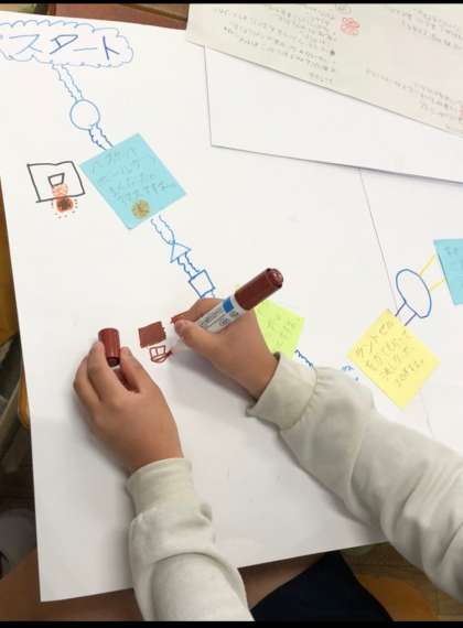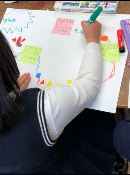 大きくなった自分のことを振り返りました。これまでのできごとを思い出し、できるようになったことをまとめました。その中から、エピソードを10こ選んで付箋に書き、「成長すごろく」をつくりました。進むマスと戻るマスにどんなできごとを入れるか考えながら、自分の成長を振り返りました。