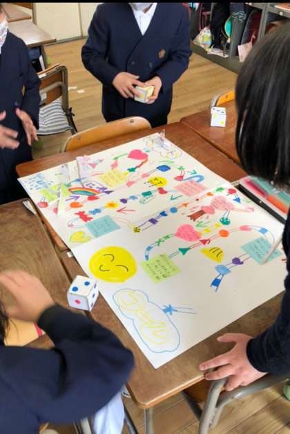 完成した後は、算数科でつくったさいころを使って、班のみんなとすごろくをして遊びました。