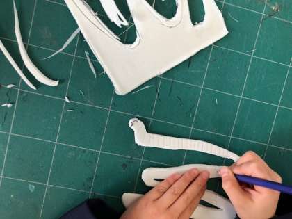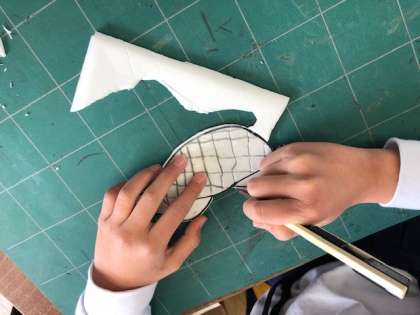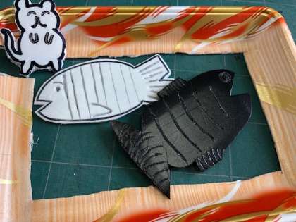家から持ってきてくれたトレーを使い、生き物を表現しました。鉛筆でも簡単に模様をつけることができます。表と裏の模様を変えて工夫することができていました。