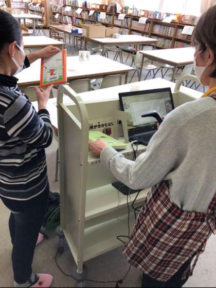 朝早くから、学校図書館補助員の先生と、たくさんの図書館ボランティアの方が来てくださり、作業してくださっています。