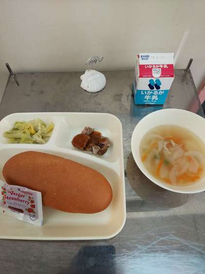 豚肉のデミグラスソース、スープ、キャベツとコーンのソテー