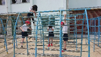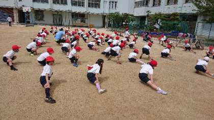 今日は、学年での初めての体育をしました。柔軟体操や鉄棒・登り棒にろくぼく・うんていなど、体つくりに欠かせない運動遊びを全力で行いました。自分の得意・不得意もありますが、互いに声を掛け合い、励まし合いながら取り組む姿を見ることができました。