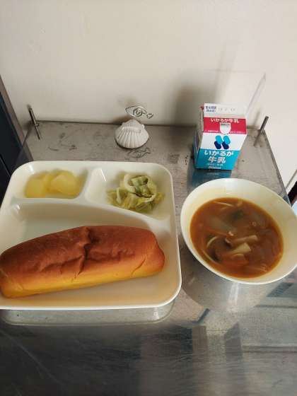 カレースープスパゲッティ、キャベツのピクルス、りんご(カット缶)