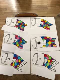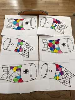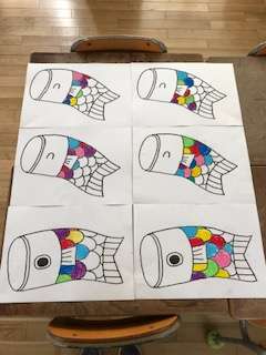 図工の時間にこいのぼりの色を塗りました。丁寧に7色の色が塗れるかなお楽しみ!。5月の玄関掲示に泳いでいます♪