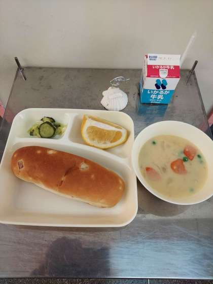 コーンクリームシチュー、キャベツときゅうりのサラダ、かわちばんかん