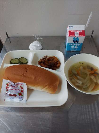 じゃがいものミートグラタン、スープ、きゅうりのバジル風味サラダ