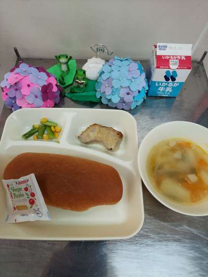 かつおのガーリックマヨネーズ焼き、ベーコンと野菜のスープ、グリーンアスパラガスのソテー