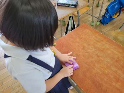 また、梅雨と言えばアジサイ…と言うことで、一人ひとりが折り紙でつくった花を、たくさん集めて大きなアジサイにしました。