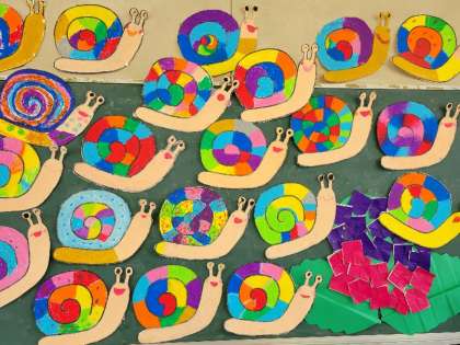 かたつむりの学習では、様々な色やかわいい模様をつけて、世界に一つだけのオリジナルかたつむりをかきました。