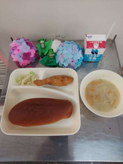 サーモンフライ、豆乳スープ、キャベツのソテー