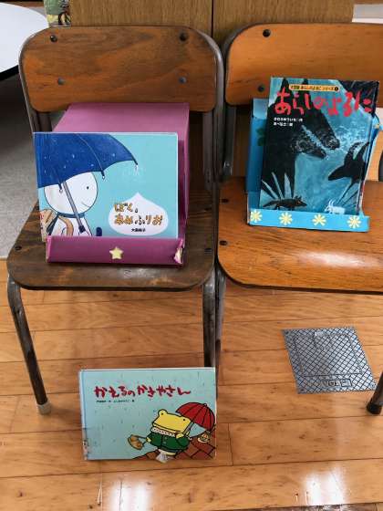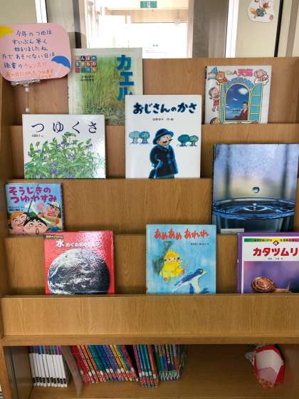 図書室の入り口横の展示台には、梅雨の時期にちなんだ「雨の日にぴったりの本」を集めてみました。