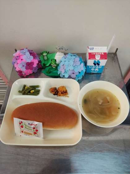 豚肉のカレーマヨネーズ焼き、てぼ豆のスープ、さんどまめとコーンのサラダ