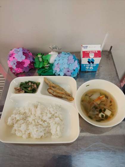 いわしてんぷら、五目汁、豚肉とさんどまめのいためもの