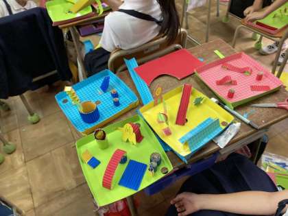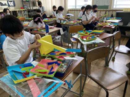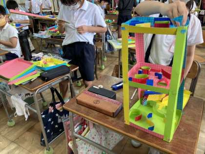 なかなかボンドがうまく付かなかったり思い通りにビー玉が転がらなかったりする事もありますが、みんな夢中になって作成しています。凸凹道・トンネル・すべり台など工夫を凝らしていて完成が楽しみです。
