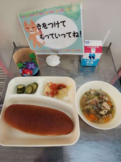 鶏肉とてぼ豆のスープ煮、じゃがいもとトマトのチーズ焼き、きゅうりのサラダ
