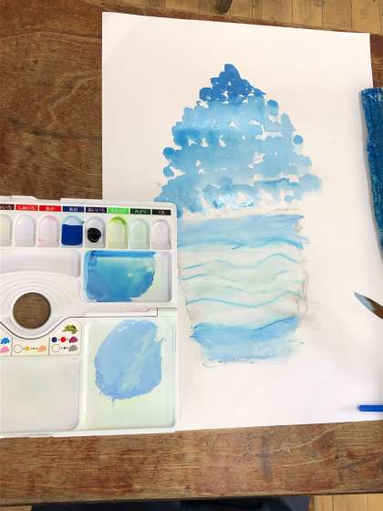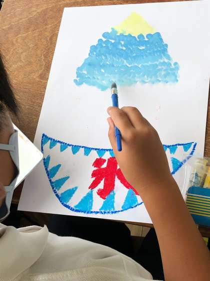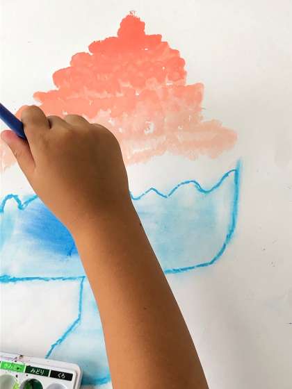 かき氷を入れる器をパスで描いた後、好きなシロップを想像して使う色を決めました。水を少しずつ入れてだんだんうすくなるように点描しました。暑い夏にぴったりな、冷たいかき氷が完成しました。