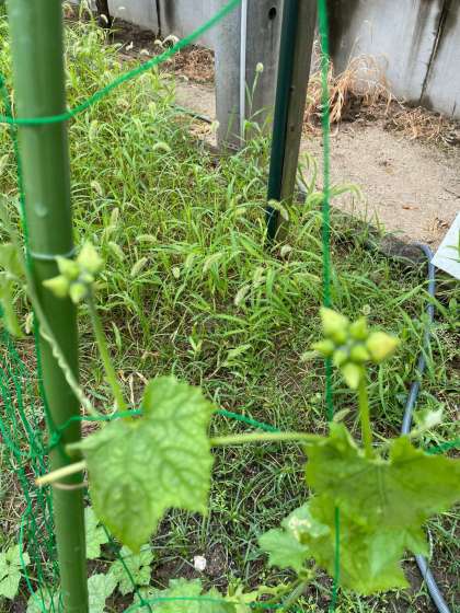 さてさて、へちまの続報です。今朝水やりへ行くと、花が咲いているのを見つけました!ぐんぐんツルも伸びて支柱を越えそうなくらいに成長しています。