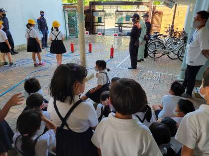 地震の避難訓練の後、各クラスブースに分かれ、「火事のDVD視聴」「水消火器体験」「新聞紙スリッパ作り」を体験しました。