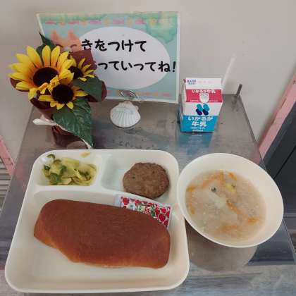 焼きハンバーグ、豆乳スープ、キャベツとピーマンのソテー