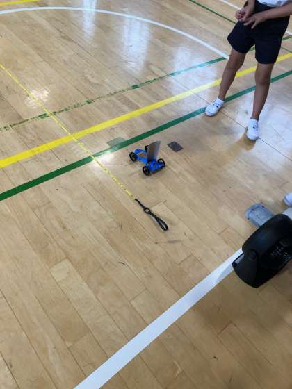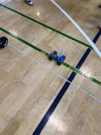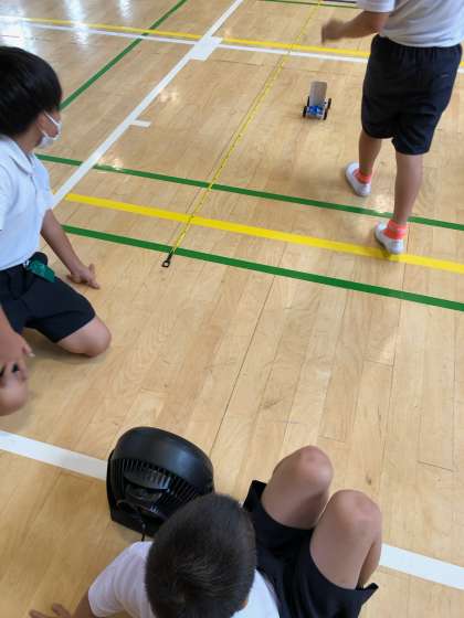 風の力で動く車を組み立てて、風の強さと車が動くきょりについて調べました。