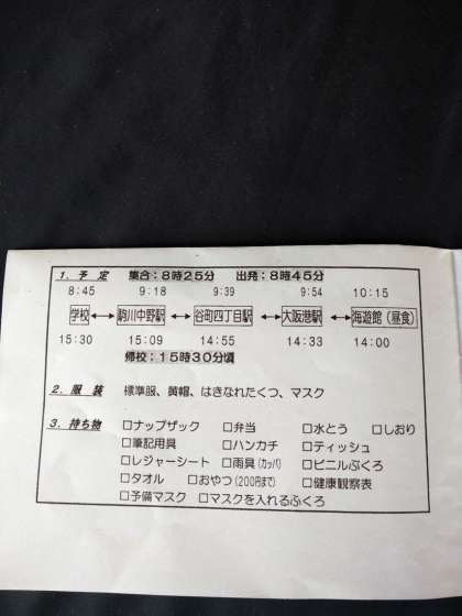 そして、運動会が終わると、すぐに秋の遠足があります。1週間前になりましたので、遠足のしおりを配っています。今年は海遊館にいく予定をしています。みんで楽しく安全にいけるようにしたいと思います。