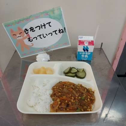 大豆入りキーマカレーライス(米粉)、きゅうりのピクルス、白桃(カット缶)