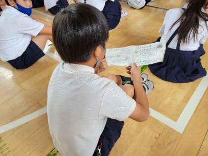 本日は、学年で集まり、来週に控えた遠足の説明を行いました。ふたかみパーク、という奈良県の自然あふれる公園に行きます。コロナの関係で遠足等の行事が減っている今、集団行動時のマナーやルールを学ぶよいきっかけです。しおりに従って一通り説明をしてあります。また、ご家庭でも子どもたちとお話をしながら、準備をしていただけたらと思います。