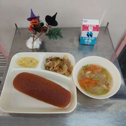 豚肉と野菜のケチャップソテー、スープ、スイートポテト