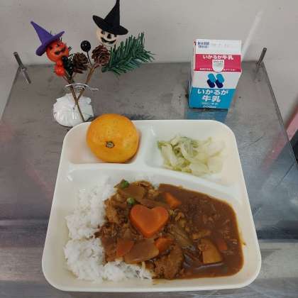 ポークカレーライス(米粉)、キャベツのピクルス、みかん