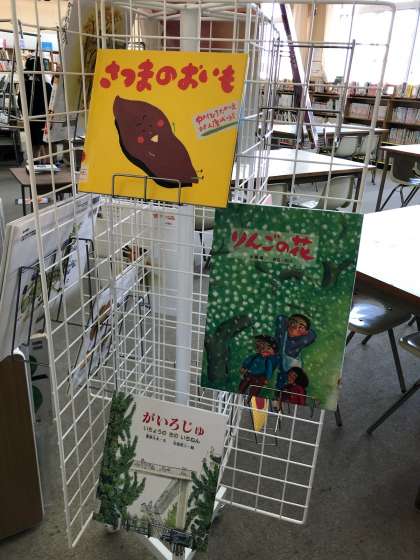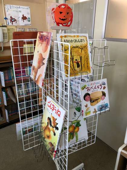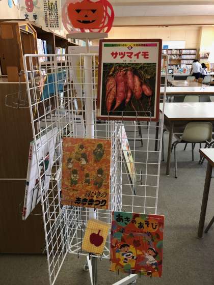 図書室の奥にある回転本棚には、「秋にちなんだ本」を集めてみました。