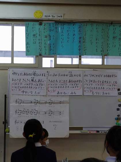 歌を歌うときには、まだマスクはつけないといけませんが、きれいな歌声で「ゆかいに歩けば」を歌っています。