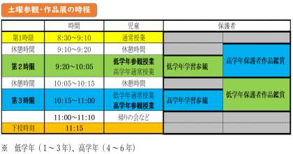 ・ 土曜参観(作品展)当日、お越しになれない方のために、11月5日(金)の放課後(15:30〜17:00)に講堂を開放しますので、ご鑑賞ください。来校前に必ず検温し、発熱等風邪様症状がある場合は、来校はご遠慮ください。
