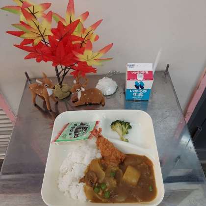 えびフライカレーライス、ブロッコリーのサラダ、ソフト黒豆