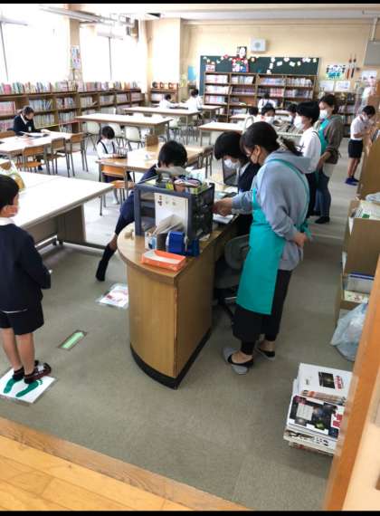 図書館ボランティアの方々と図書館補助員の先生、委員会児童が、開放と返却・貸し出しをしています。
