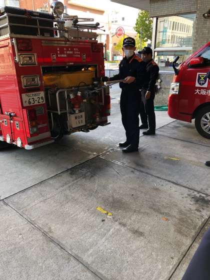 実際にホースを持たせていただきました。両手で持ち上げるだけで精一杯です。水が入るともっと重くなるようです。